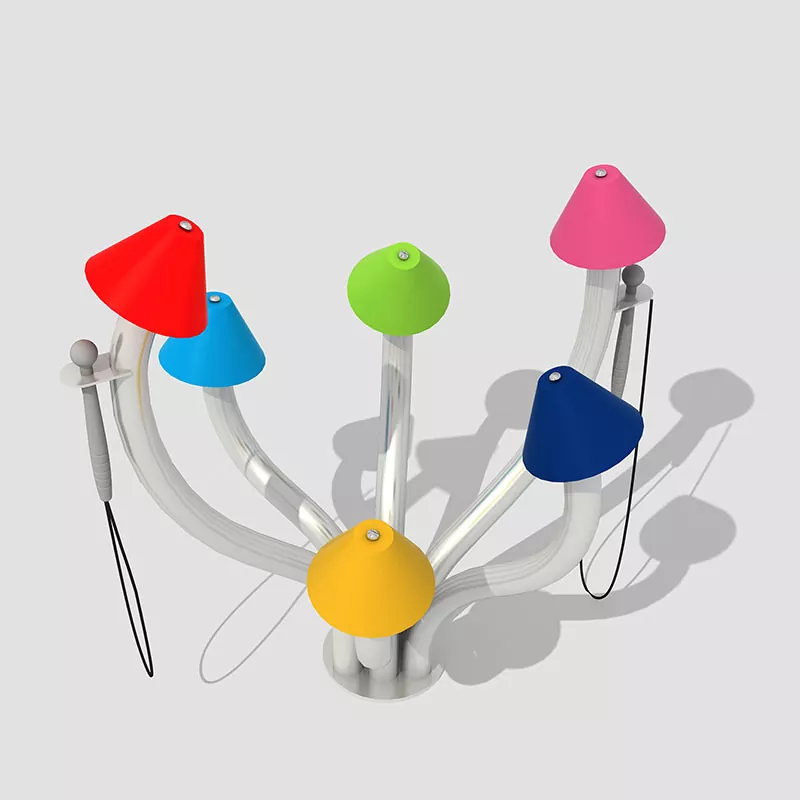 Sada šesti kónických "klobouků" s práškovým nástřikem se zářivými barvami, obsahující vlnité tyče z nerezové oceli v různých výškách a úhlech, což z ní dělá výrazný prvek, který se brzy stane nejoblíbenějším.